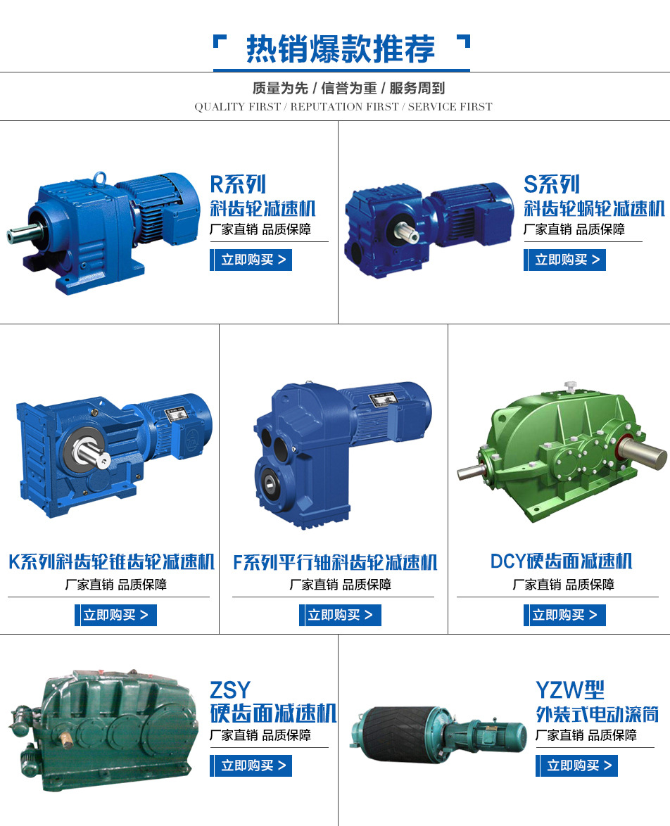 我廠主打產(chǎn)品為R、S、K、F系列斜齒輪減速機,ZSY、ZLYJ、ZD重型齒輪減速機,B、X系列擺線針輪減速機,WP、NMRV蝸輪蝸桿減速機,P系列行星減速機,TDY電滾筒及各種非標(biāo)減速機.廣泛應(yīng)用于制金.包裝,紡織,塑料機械,化工.電工機械等眾多行業(yè)。